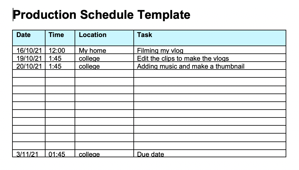 This is the first part of my schedule for filming my vlog and where and when I will film it. I made this to show how i am going to fit in all of my filming so i am organised .
