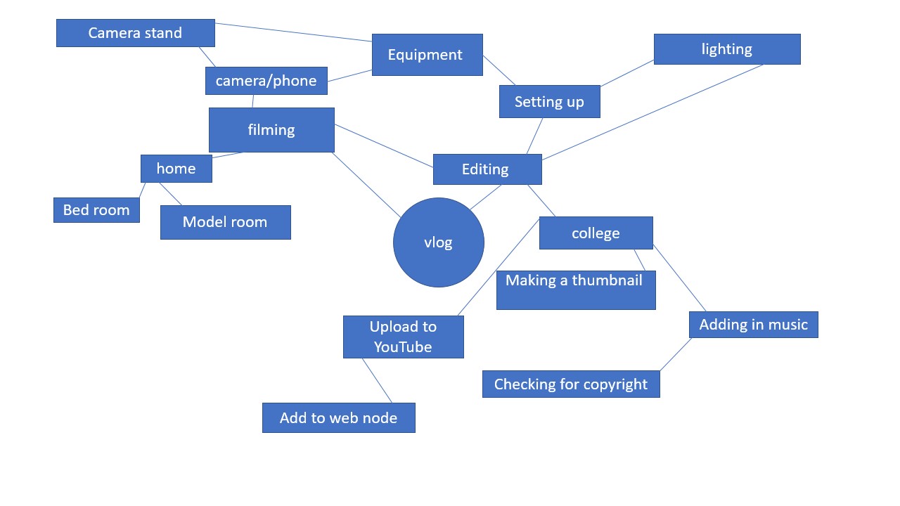 This is a mind map of what is going to happen in my vlog starting from the setting up to the filming and then the editing of the video. This is a grate way to get a head start on the production of my vlog because I can see what i need when filming .